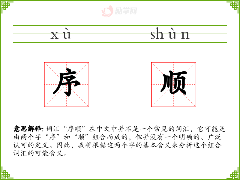 词汇“序顺”在中文中并不是一个常见的词汇,它可能是由两个字“序”和“顺”组合而成的,但并没有一个明确的、广泛认可的定义。因此,我将根据这两个字的基本含义来分析这个组合词汇的可能含义。
