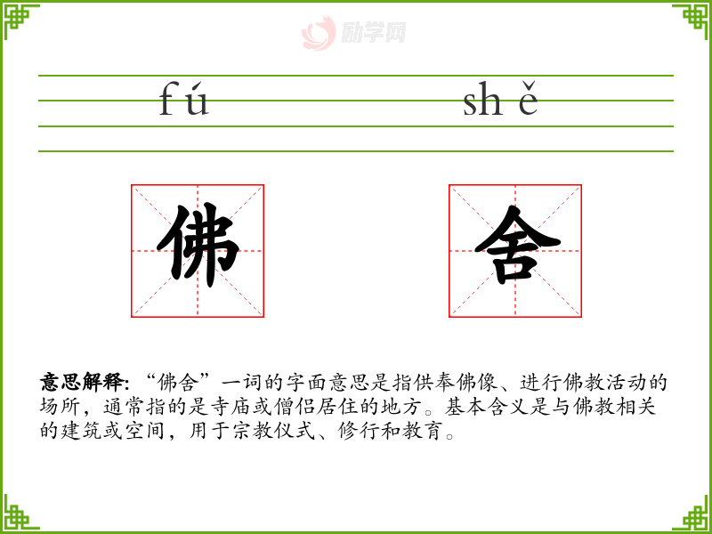 “佛舍”一词的字面意思是指供奉佛像、进行活动的场所,通常指的是寺庙或僧侣居住的地方。基本含义是与相关的建筑或空间,用于**仪式、修行和教育。