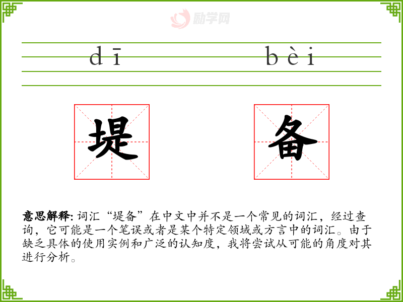 词汇“堤备”在中文中并不是一个常见的词汇,经过查询,它可能是一个笔误或者是某个特定领域或方言中的词汇。由于缺乏具体的使用实例和广泛的认知度,我将尝试从可能的角度对其进行分析。