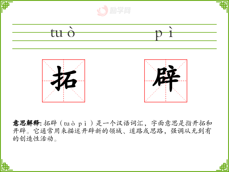 - 文学:在文学作品中,“拓辟”常用来形容主人公勇敢地探索未知世界,如“他拓辟了一条通往山外的道路”。