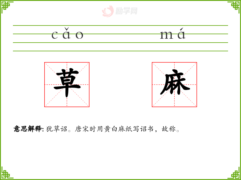 草麻的意思是:犹草诏。唐宋时用黄白麻纸写诏书,故称。
