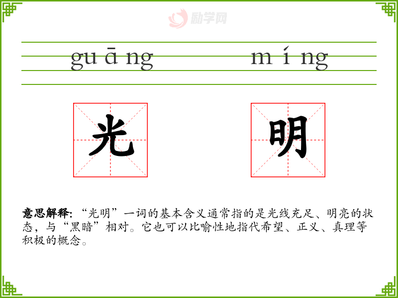 “光明”一词的基本含义通常指的是光线充足、明亮的状态,与“黑暗”相对。它也可以比喻性地指代希望、正义、真理等积极的概念。