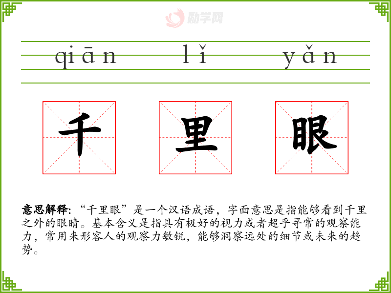 - 洞察力:指深入事物或问题的观察能力,与“千里眼”在意义上相近,但更侧重于对内在本质的理解。