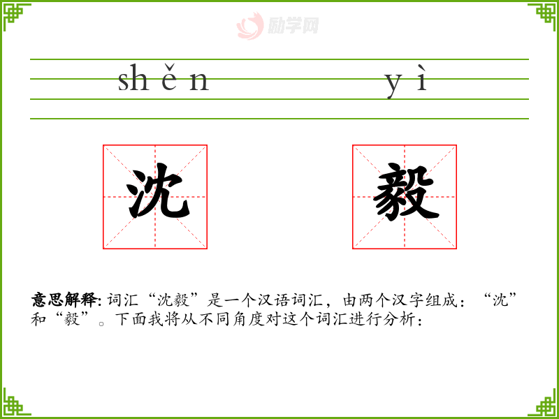 词汇“沈毅”是一个汉语词汇,由两个汉字组成:“沈”和“毅”。下面我将从不同角度对这个词汇进行分析: