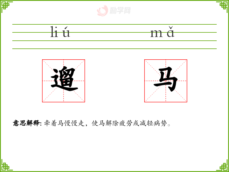 遛马的意思是:牵着马慢慢走,使马解除疲劳或减轻病势。
