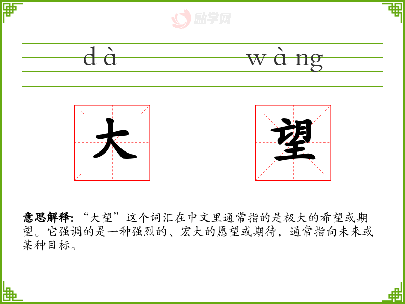 “大望”这个词汇在中文里通常指的是极大的希望或期望。它强调的是一种强烈的、宏大的愿望或期待,通常指向未来或某种目标。