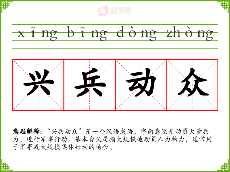 “兴兵动众”是一个汉语成语,字面意思是动员大量兵力,进行军事行动。基本含义是指地动员人力物力,通常用于军事或集体行动的场合。