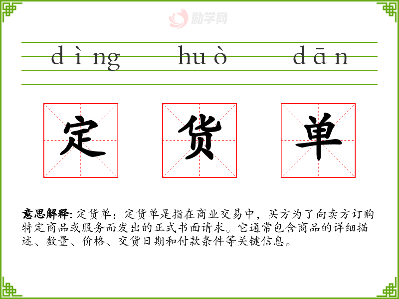定货单:定货单是指在商业交易中,买方为了向卖方订购特定商品或服务而发出的正式书面请求。它通常包含商品的详细描述、数量、价格、交货日期和付款条件等关键信息。