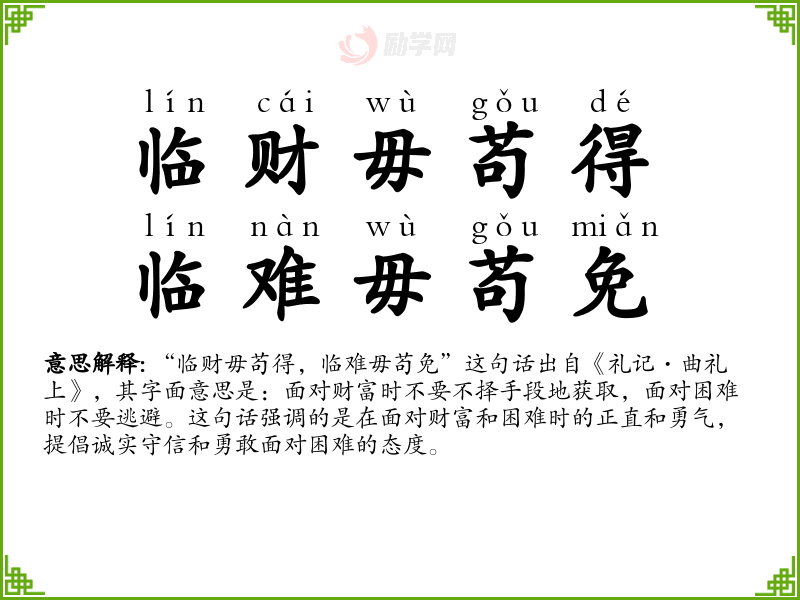 “临财毋苟得,临难毋苟免”这句话出自《礼记·曲礼上》,其字面意思是:面对财富时不要不择手段地获取,面对困难时不要逃避。这句话强调的是在面对财富和困难时的正直和勇气,提倡诚实守信和勇敢面对困难的态度。