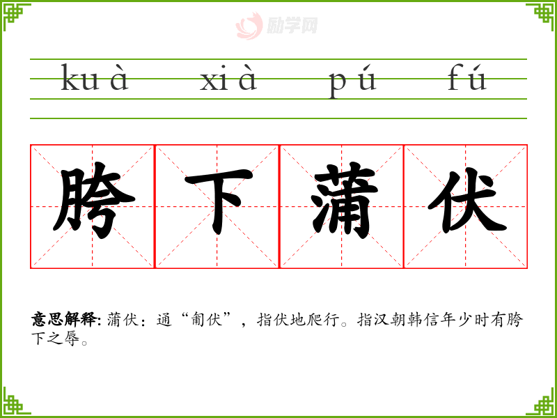《说文》。段注:“合两股言曰胯。”-胯,股也。 《史记·淮阴侯传》-出我胯下。 《水浒传》-[李逵]要奔城边劈门,被燕青抱住腰胯。