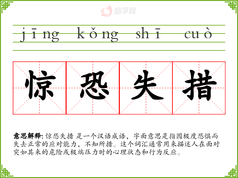 惊恐失措 是一个汉语成语,字面意思是指因极度恐惧而失去正常的应对能力,不知所措。这个词汇通常用来描述人在面对突如其来的危险或极端压力时的心理状态和行为反应。