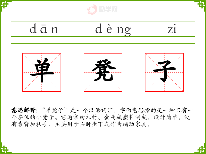 “单凳子”是一个汉语词汇,字面意思指的是一种只有一个座位的小凳子。它通常由木材、金属或塑料制成,设计简单,没有靠背和扶手,主要用于临时坐下或作为辅助家具。
