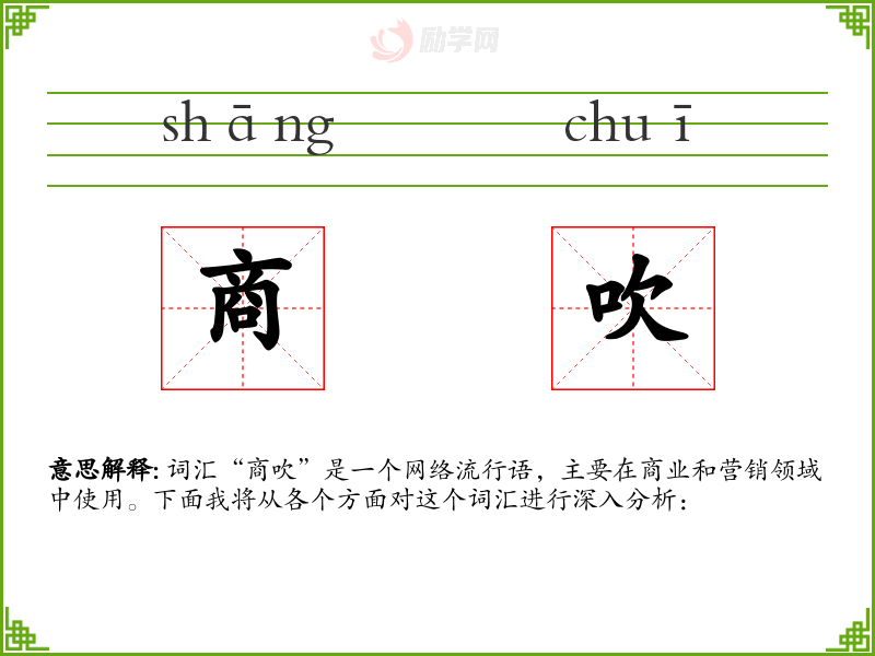 词汇“商吹”是一个网络流行语,主要在商业和营销领域中使用。下面我将从各个方面对这个词汇进行深入分析: