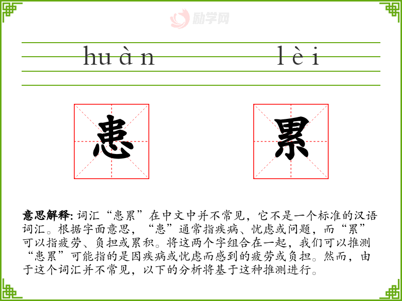 词汇“患累”在中文中并不常见,它不是一个标准的汉语词汇。根据字面意思,“患”通常指疾病、忧虑或问题,而“累”可以指疲劳、负担或累积。将这两个字组合在一起,我们可以推测“患累”可能指的是因疾病或忧虑而感到的疲劳或负担。然而,由于这个词汇并不常见,以下的分析将基于这种推测进行。