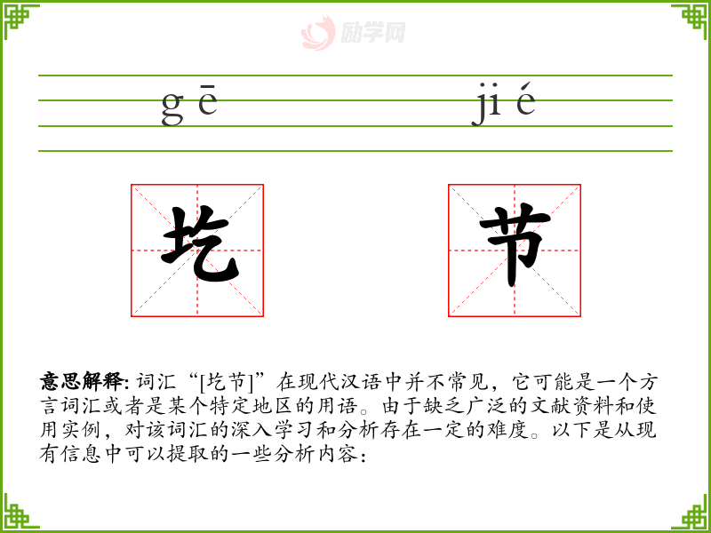 词汇“[圪节]”在现代汉语中并不常见,它可能是一个方言词汇或者是某个特定地区的用语。由于缺乏广泛的文献资料和使用实例,对该词汇的深入学习和分析存在一定的难度。以下是从现有信息中可以提取的一些分析内容: