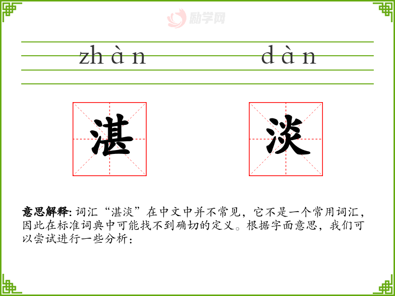 词汇“湛淡”在中文中并不常见,它不是一个常用词汇,因此在标准词典中可能找不到确切的定义。根据字面意思,我们可以尝试进行一些分析: