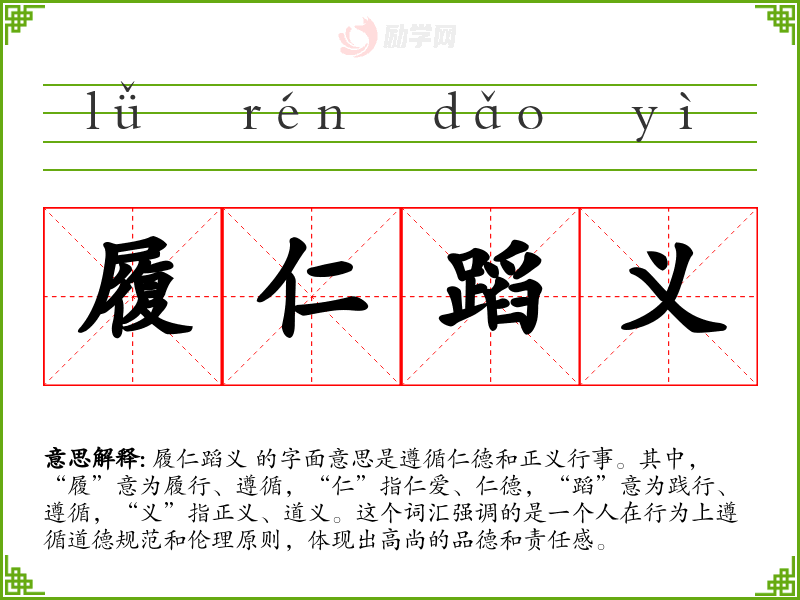 履仁蹈义 的字面意思是遵循仁德和正义行事。其中,“履”意为履行、遵循,“仁”指仁爱、仁德,“蹈”意为践行、遵循,“义”指正义、道义。这个词汇强调的是一个人在行为上遵循道德规范和伦理原则,体现出高尚的品德和责任感。