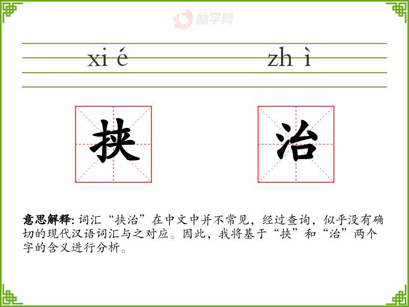 词汇“挟治”在中文中并不常见,经过查询,似乎没有确切的现代汉语词汇与之对应。因此,我将基于“挟”和“治”两个字的含义进行分析。
