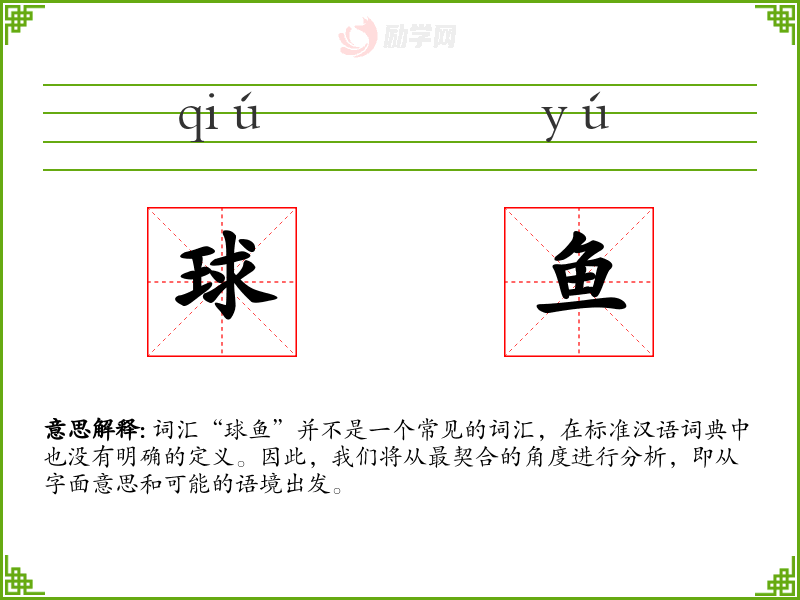 词汇“球鱼”并不是一个常见的词汇,在标准汉语词典中也没有明确的定义。因此,我们将从最契合的角度进行分析,即从字面意思和可能的语境出发。