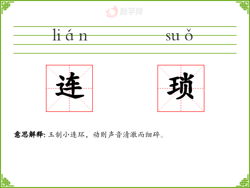 连琐的意思是:玉制小连环,动则声音清澈而细碎。