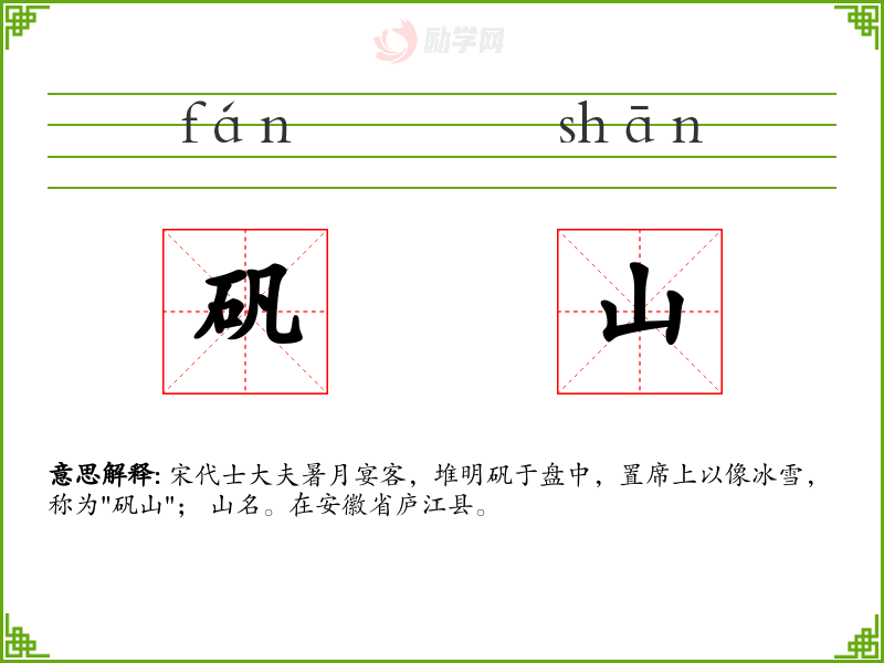 矾山的意思是:宋代士大夫暑月宴客,堆明矾于盘中,置席上以像冰雪,称为"矾山"; 山名。在安徽省庐江县。