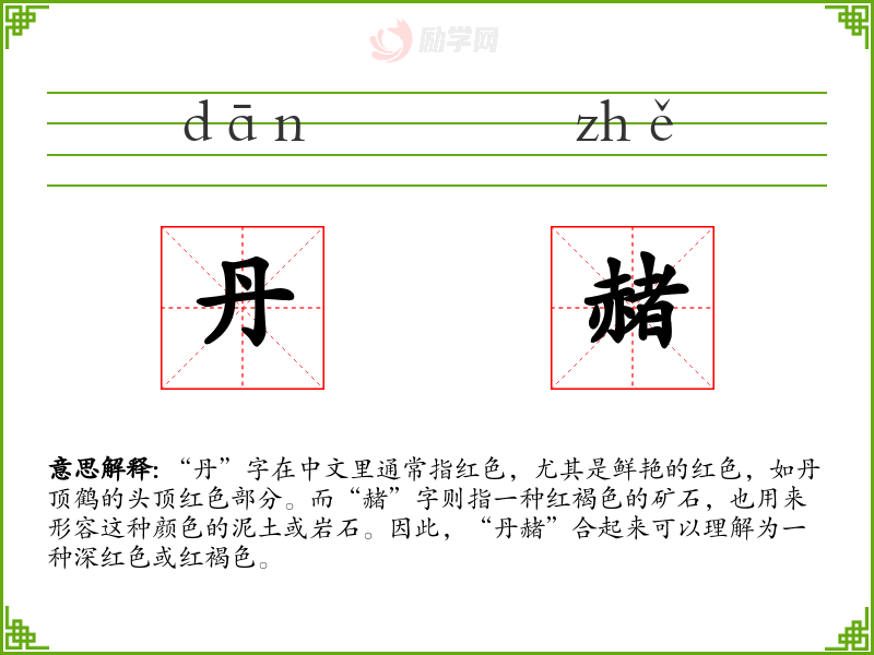 “丹”字在中文里通常指红色,尤其是鲜艳的红色,如丹顶鹤的头顶红色部分。而“赭”字则指一种红褐色的矿石,也用来形容这种颜色的泥土或岩石。因此,“丹赭”合起来可以理解为一种深红色或红褐色。