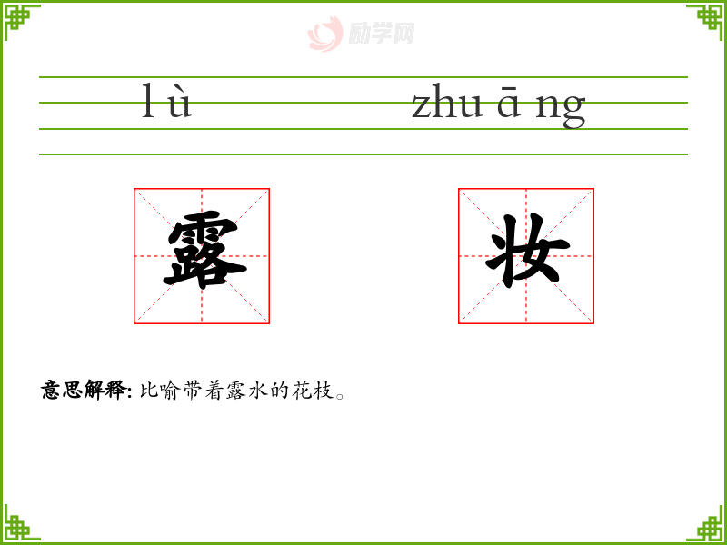 妆[ zhuāng ] 1. (形声。从女,爿(pán)声。本义:梳妆打扮)。 2. 同本义。 【引证】 《说文》。字亦作娤。-妝,饰也。 宋玉《登徒子好色赋》-不待饰装(妆)。 司马相如《上林赋》-靓莊(妆)刻饰。 唐·白居易《琵琶行》-曲罢曾教善才服,妆成每被秋娘妒。 [更多解释]