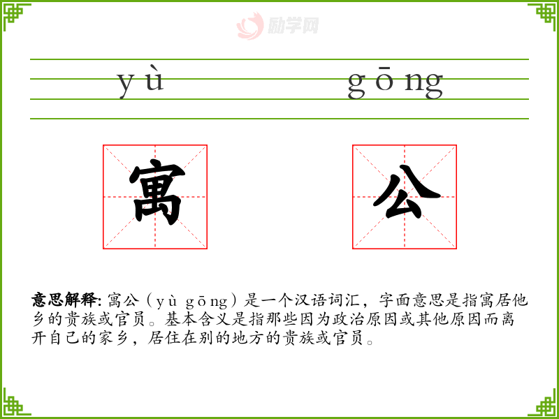 寓公(yù gōng)是一个汉语词汇,字面意思是指寓居他乡的贵族或官员。基本含义是指那些因为政治原因或其他原因而离开自己的家乡,居住在别的地方的贵族或官员。