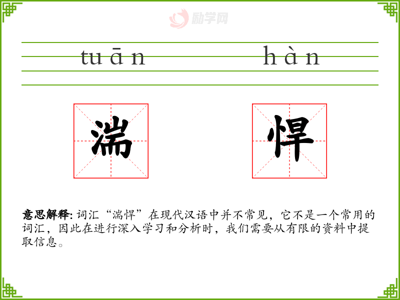 词汇“湍悍”在现代汉语中并不常见,它不是一个常用的词汇,因此在进行深入学*和分析时,我们需要从有限的资料中提取信息。
