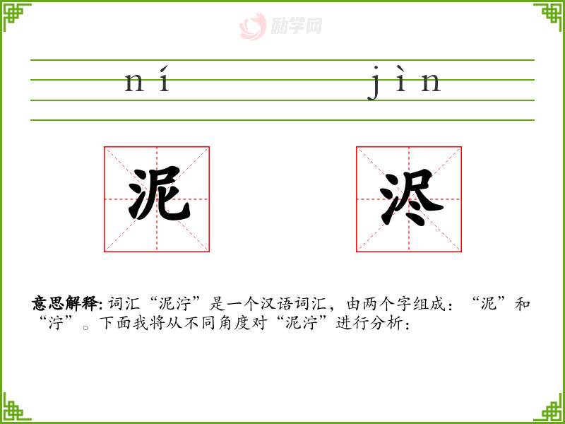 - 字面意思:“泥”指的是泥土,尤其是湿润的泥土;“泞”指的是泥泞,即泥土因水分过多而变得黏稠、难以行走。