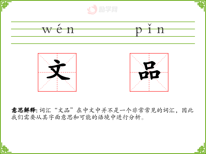 词汇“文品”在中文中并不是一个非常常见的词汇,因此我们需要从其字面意思和可能的语境中进行分析。