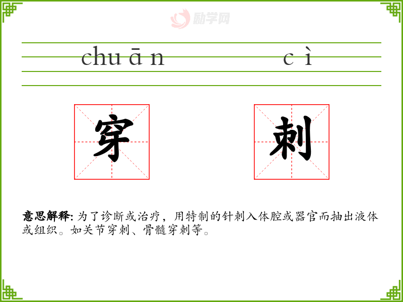 穿刺的意思是:为了诊断或治疗,用特制的针刺入体腔或器官而抽出液体或组织。如关节穿刺、骨髓穿刺等。