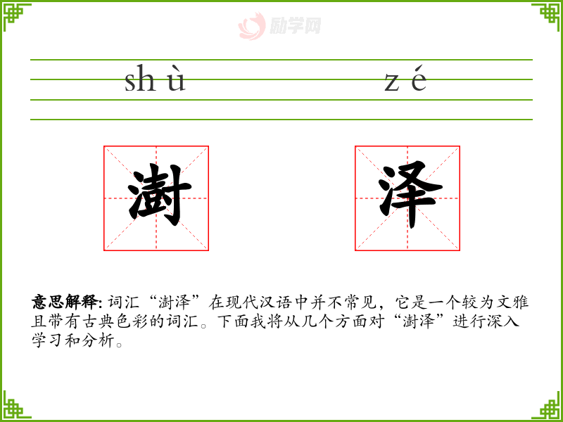 词汇“澍泽”在现代汉语中并不常见,它是一个较为文雅且带有古典色彩的词汇。下面我将从几个方面对“澍泽”进行深入学*和分析。