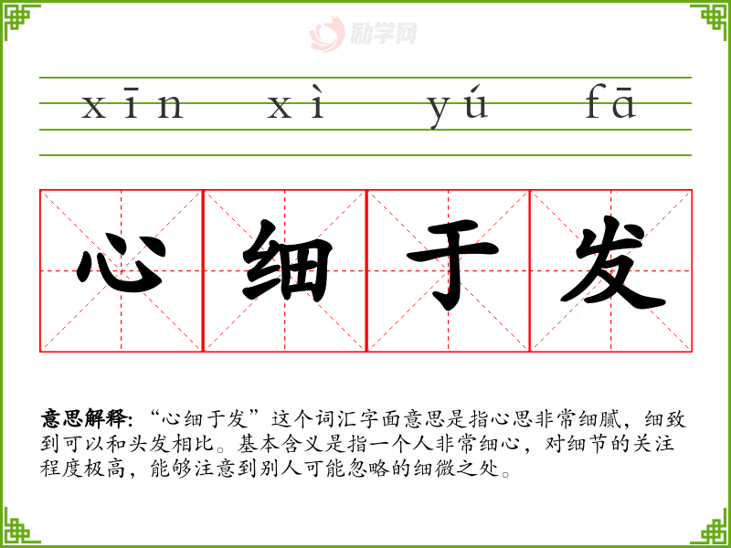 “心细于发”这个词汇字面意思是指心思非常细腻,细致到可以和头发相比。基本含义是指一个人非常细心,对细节的关注程度极高,能够注意到别人可能忽略的细微之处。