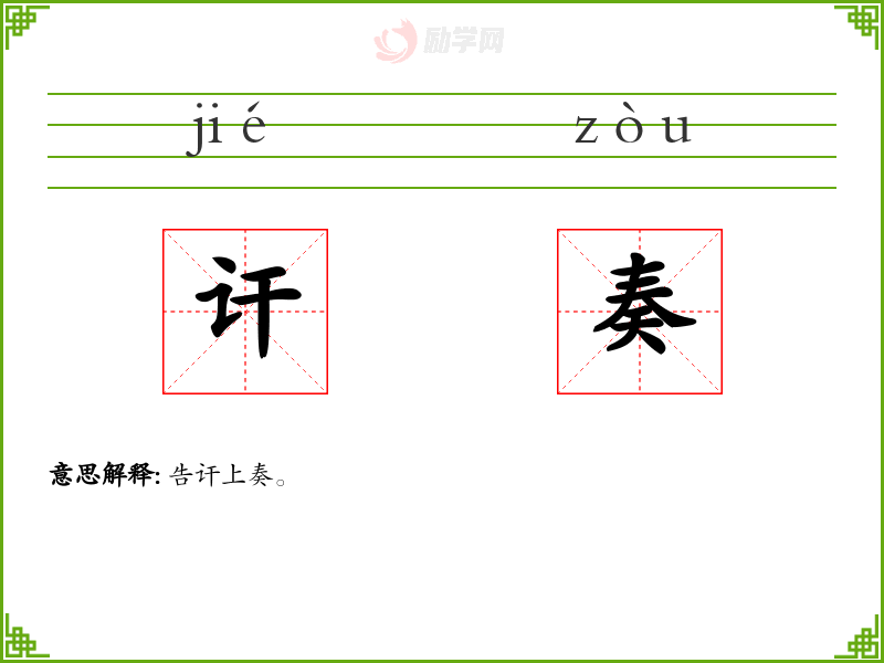 《说文》-奏,进也。 《虞书》-敷奏以言。 《诗·小雅·六月》-以奏肤公。 《诗·小雅·宾之初筵》-各奏尔能。 《书·益稷》-予乘四载,随水刊木,既益奏庶鲜食。 《史记·廉颇蔺相如列传》-相如奉璧奏秦王。 清·黄宗羲《柳敬亭传》-使奏其技。 《论衡·逢遇》-以夏进炉,以冬奏扇。 萧纪《同萧长史看妓》-燕姬奏妙舞,郑女发清歌。 方苞《狱中杂记》-俟封奏时潜易之而己。