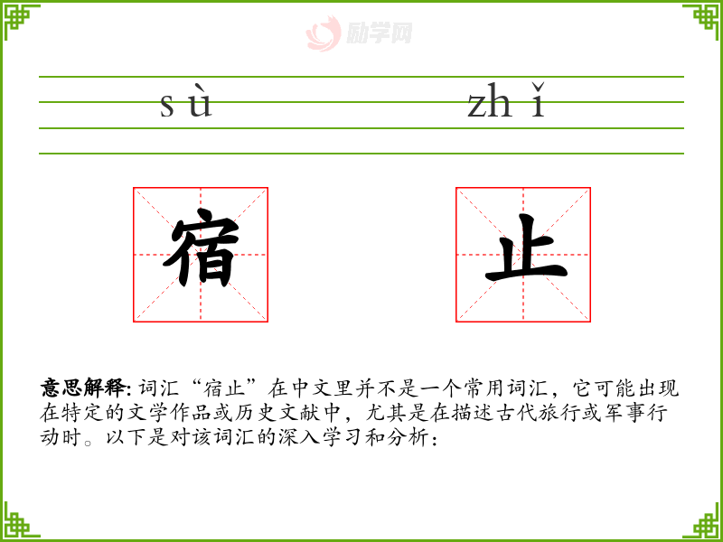 词汇“宿止”在中文里并不是一个常用词汇,它可能出现在特定的文学作品或历史文献中,尤其是在描述古代旅行或军事行动时。以下是对该词汇的深入学习和分析: