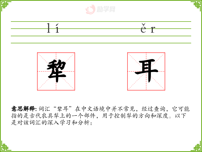 词汇“犂耳”在中文语境中并不常见,经过查询,它可能指的是古代农具犁上的一个部件,用于控制犁的方向和深度。以下是对该词汇的深入学*和分析: