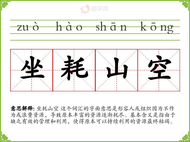 坐耗山空 这个词汇的字面意思是形容人或组织因为不作为或浪费资源,导致原本丰富的资源逐渐耗尽。基本含义是指由于缺乏有效的管理和利用,使得原本可以持续利用的资源最终枯竭。
