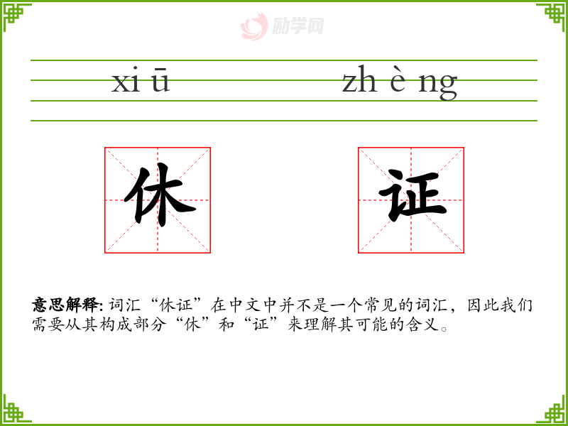 词汇“休证”在中文中并不是一个常见的词汇,因此我们需要从其构成部分“休”和“证”来理解其可能的含义。