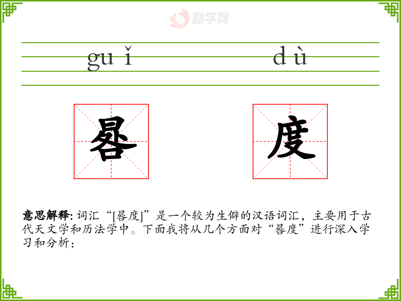 词汇“[晷度]”是一个较为生僻的汉语词汇,主要用于古代天文学和历法学中。下面我将从几个方面对“晷度”进行深入学*和分析: