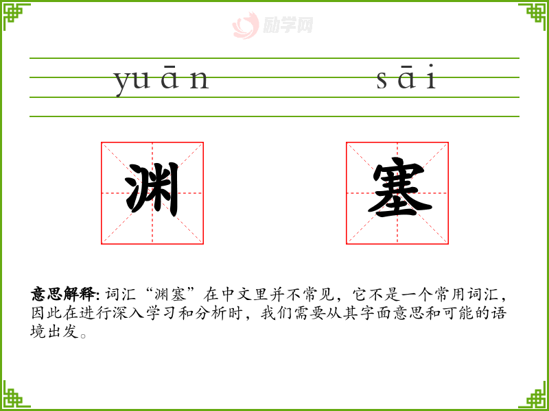 词汇“渊塞”在中文里并不常见,它不是一个常用词汇,因此在进行深入学习和分析时,我们需要从其字面意思和可能的语境出发。