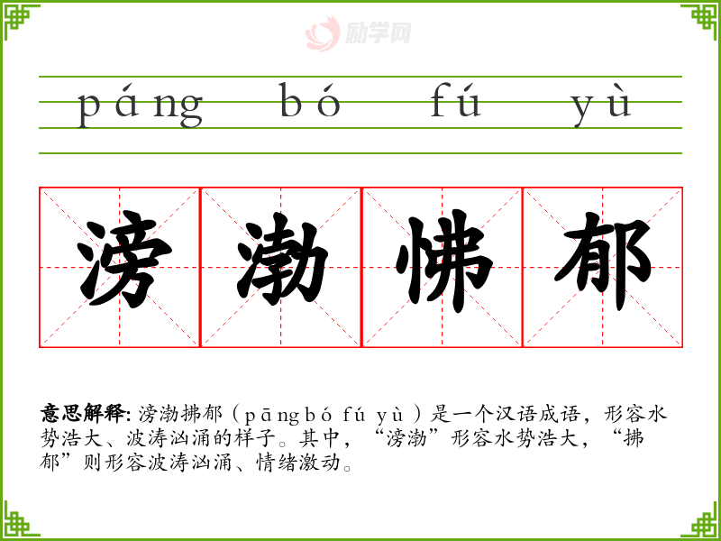 - 理解:滂渤拂郁是一个富有形象和力量的成语,能够生动地描绘出水势的浩大和波涛的汹涌。