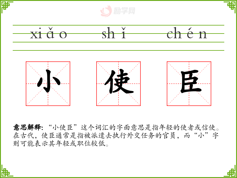 “小使臣”这个词汇的字面意思是指年轻的使者或信使。在古代,使臣通常是指被派遣去执行外交任务的官员,而“小”字则可能表示其年轻或职位较低。
