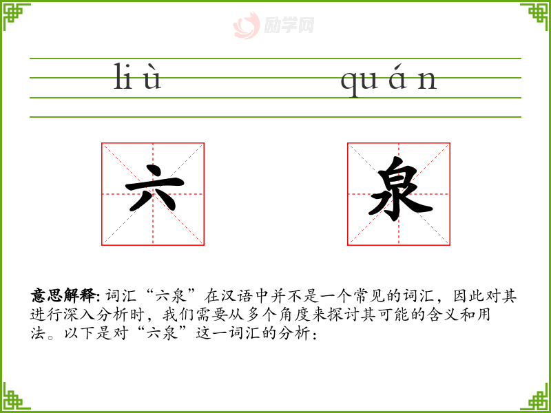 - 同义词:六泉的同义词可能包括“六泉眼”、“六泉池”等,都是指有六个泉眼的地方。