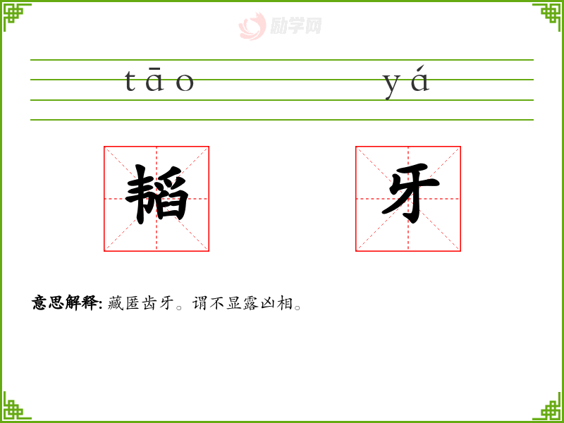 韬牙的意思是:藏匿齿牙。谓不显露凶相。