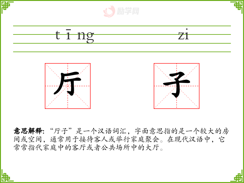 “厅子”是一个汉语词汇,字面意思指的是一个较大的房间或空间,通常用于接待客人或举行家庭聚会。在现代汉语中,它常常指代家庭中的客厅或者公共场所中的大厅。