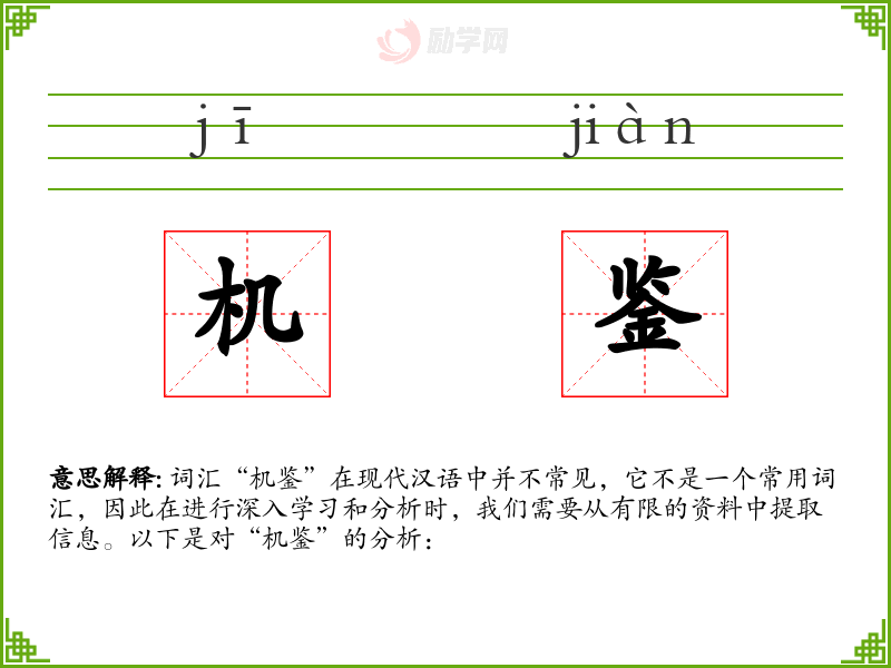 词汇“机鉴”在现代汉语中并不常见,它不是一个常用词汇,因此在进行深入学*和分析时,我们需要从有限的资料中提取信息。以下是对“机鉴”的分析: