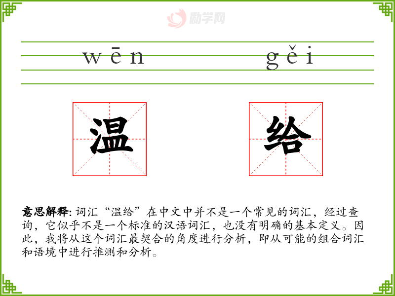 由于“温给”不是一个标准词汇,我们无法给出一个确切的字面意思和基本含义。它可能是由“温”和“给”两个字组合而成的,但这种组合在标准汉语中并不常见。
