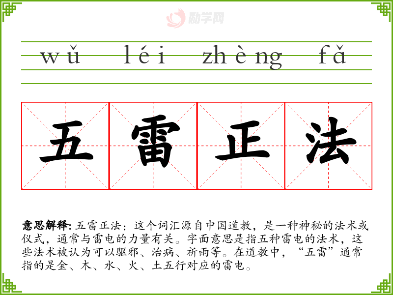 - 反义词:无(由于五雷正法是一个特定领域的术语,通常没有直接的反义词)