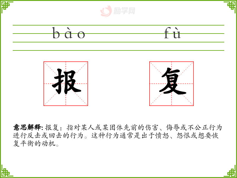 - 同义词:复仇、反击、回敬、报复性行为